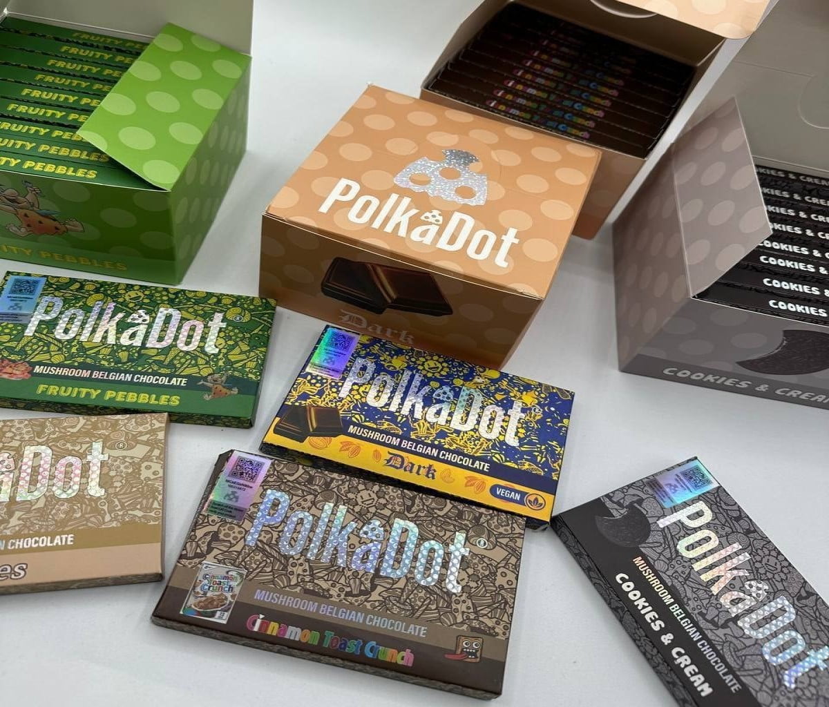 Polka dot magic mushrooms A crave-worthy chocolate to help you conquer your day–or make it an adventure depending on how you choose to dose–Polkadot mushroom belgian chocolate Couverture is not only delicious, but also the equivalent to 4g of Psilocybin & Psilocin from Psychedelic Mushrooms . Aside from the full-fledged high of eating a number of chocolates, these are helpful for those who are fans of microdosing*** as the chocolate hide the fungi flavor and you can eat 1 square at a time. Now available in Psychedelics Connect official online stores now that magic mushrooms have been decriminalized in Washington, DC. Each bar contains 15 easily-breakable pieces. polka dot mushroom